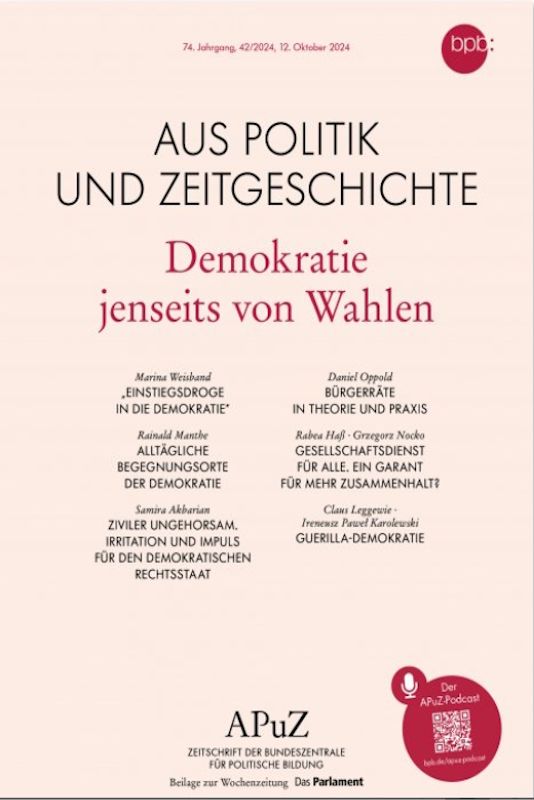 Der Gang zur Wahlurne ist der sichtbarste Akt demokratischer Teilhabe. Doch auch darüber hinaus gibt es viele Formen der Mitbestimmung, die eine Demokratie lebendig halten. Einen Überblick über aktuelle Debatten und Entwicklungen in der neuen „Aus Politik und Zeitgeschichte“ (Beilage zur Wochenzeitung „Das Parlament“) "Demokratie jenseits von Wahlen" vom 12. Oktober 2024 mit den folgenden Beiträgen: